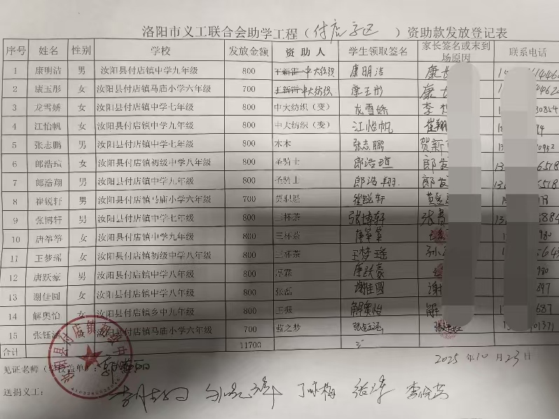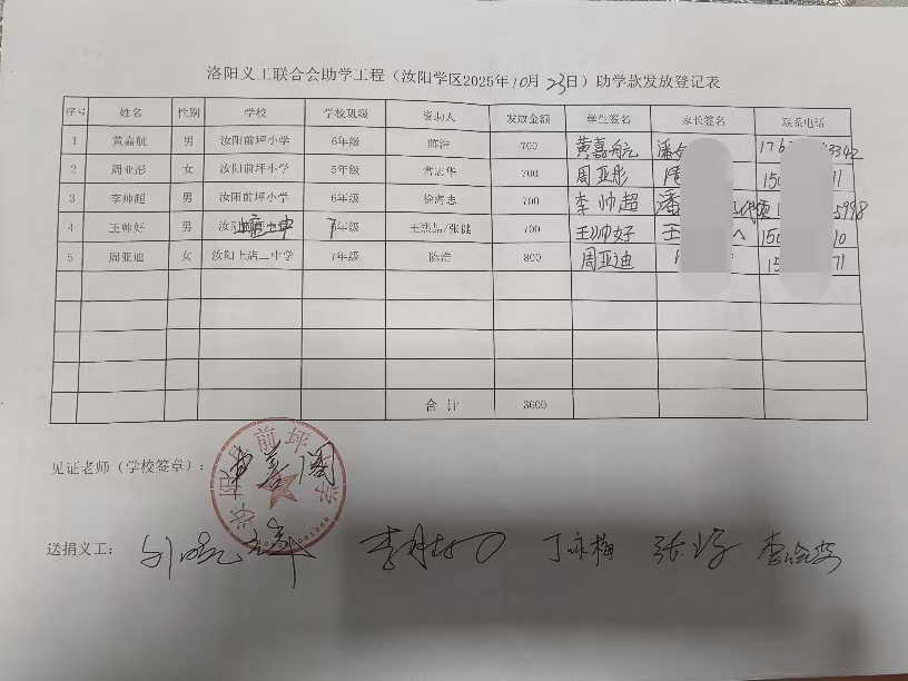 10月23日,一个阳光明媚的秋日,洛阳市义工联合会“河洛微光计划”的5位义工——张辉、李晓芳、丁咏梅、李胜利、赵晓辉怀揣着一份沉甸甸的爱,驱车前往汝阳前坪、十八盘、付店学区。不仅为31名困境学生送去了23700元助学款,更是带着资助人的大爱,把爱的种子种入受资助者的心间。