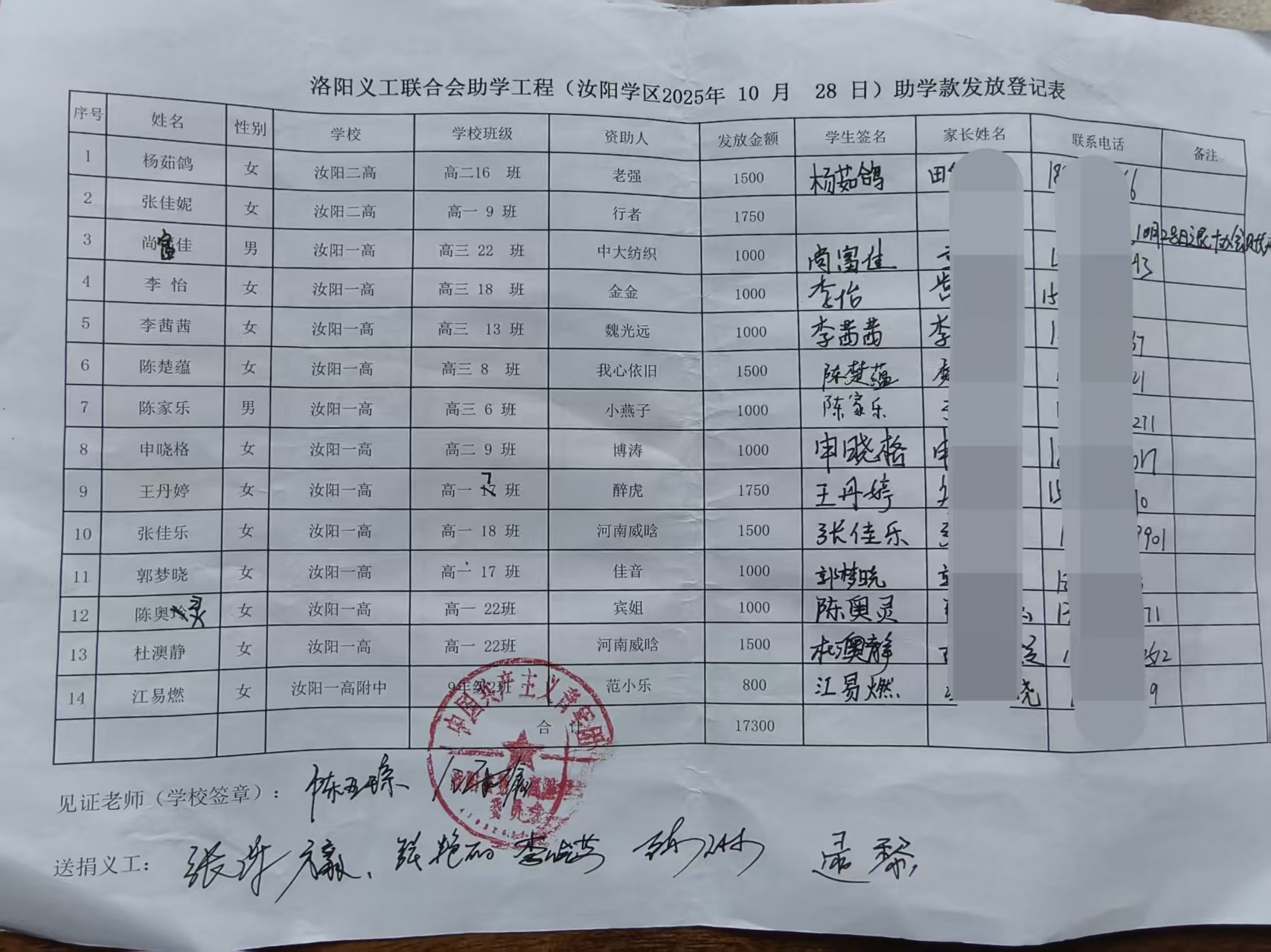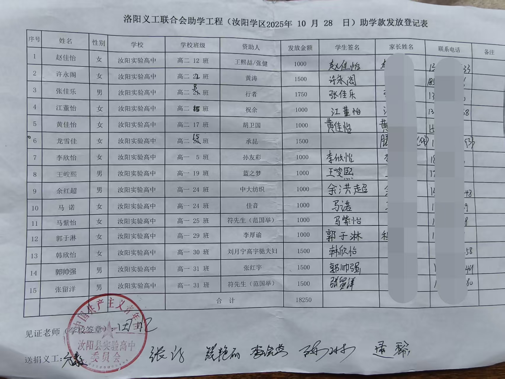 | 13 | 韩欣怡 | 女 | 汝阳实验高中 | 高一 30 班 | 刘月宁高宇驰夫妇 | 1500 |
