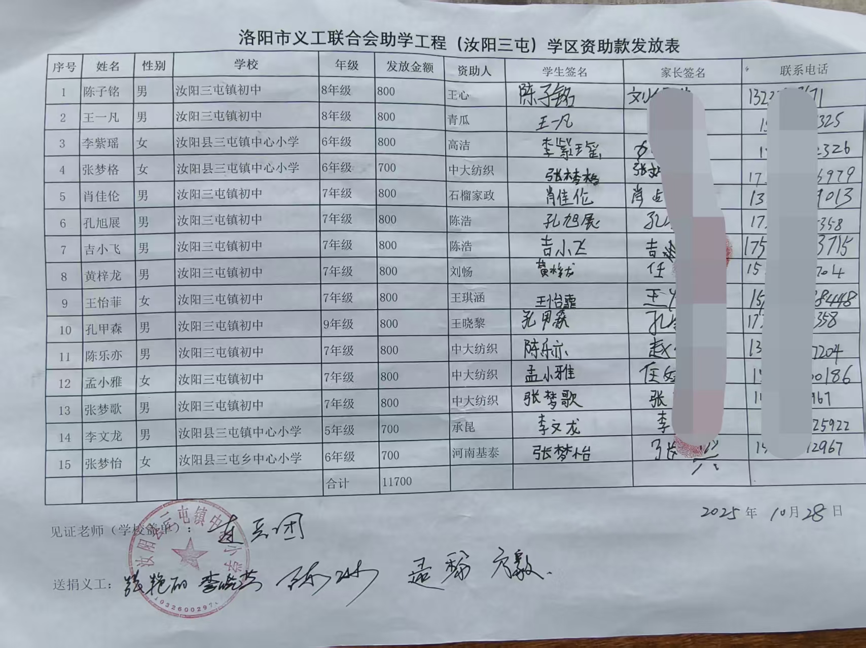 | 39 | 陈乐亦 | 男 | 汝阳三屯镇初中 | 7年级 | 中大纺织 | 800 |