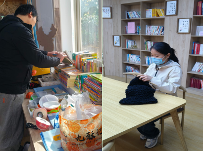 活动现场志愿者们共同整理书籍、学习织围巾。