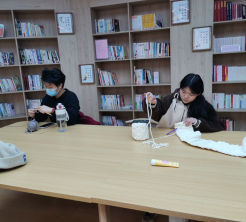 今天也少不了织围巾的活动哦!两位可爱的志愿者小伙伴,
