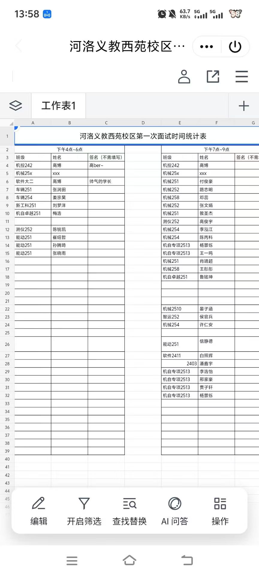 2.提前发共享文档供新生线上填写。并让面试者提前在灵析上报名,到场签到。