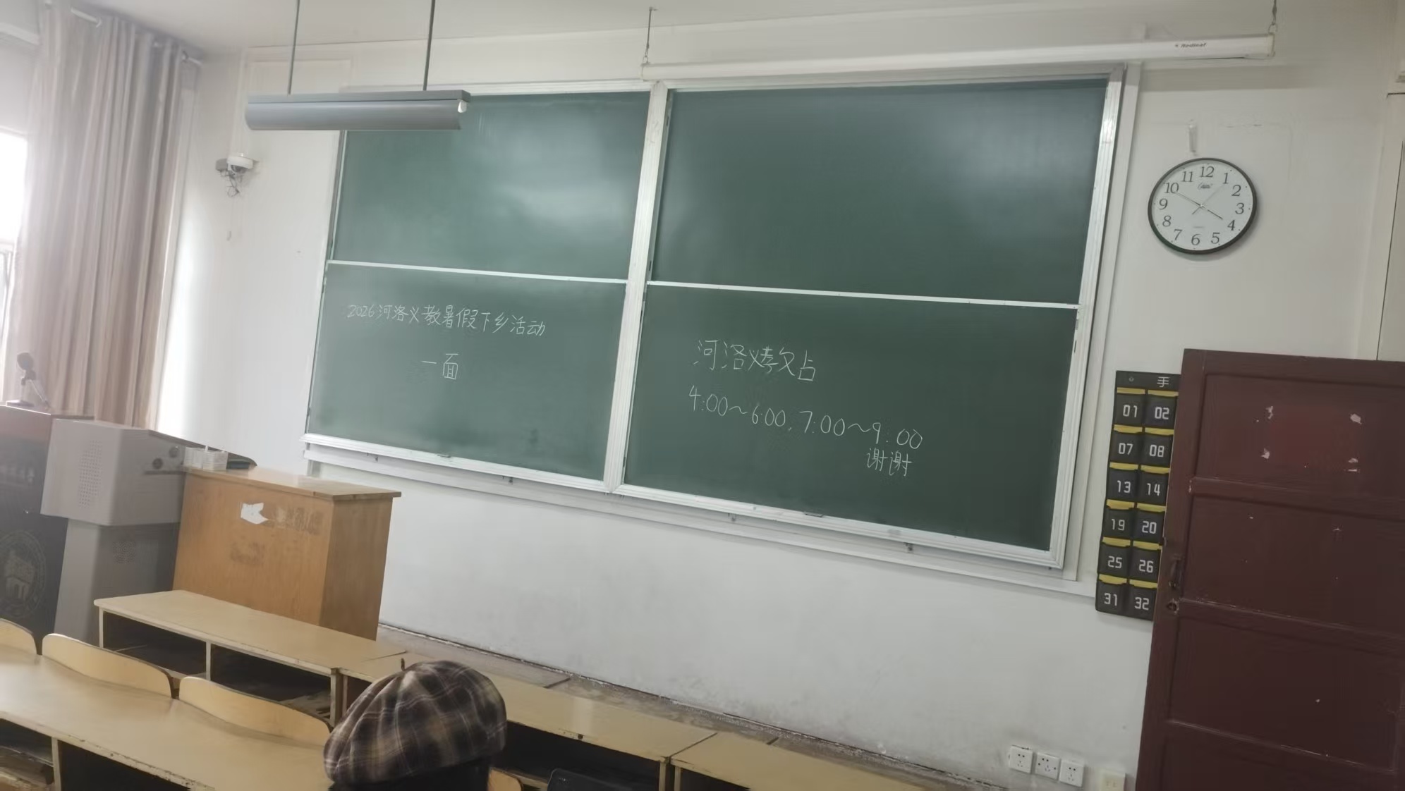 3.面试前在黑板上写好相关内容——河洛义教西苑校区第一次面试,时间日期,并在旁边黑板上贴上会旗。