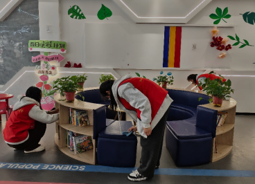 活动中一部分志愿者擦拭书架。他们对书架、桌子、沙发进行擦拭。对于较高的书架,他们互相协作确保擦拭干净。擦完之后整个阅读空间仿佛瞬间明亮、清新了许多。这份洁净,不仅是对环境的改善,也象征着为读者准备了一片更宜于沉思与学习的光明之地。志愿者们额头上沁出的细密汗珠,是这份光亮最好的注解。