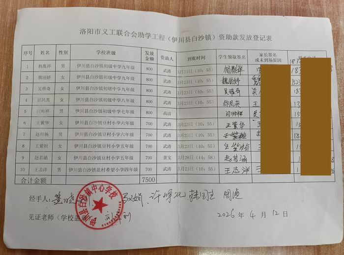 | 10 | 王志洋 | 男 | 伊川县白沙镇范村希望小学四年级 | 700 | 武涛 |