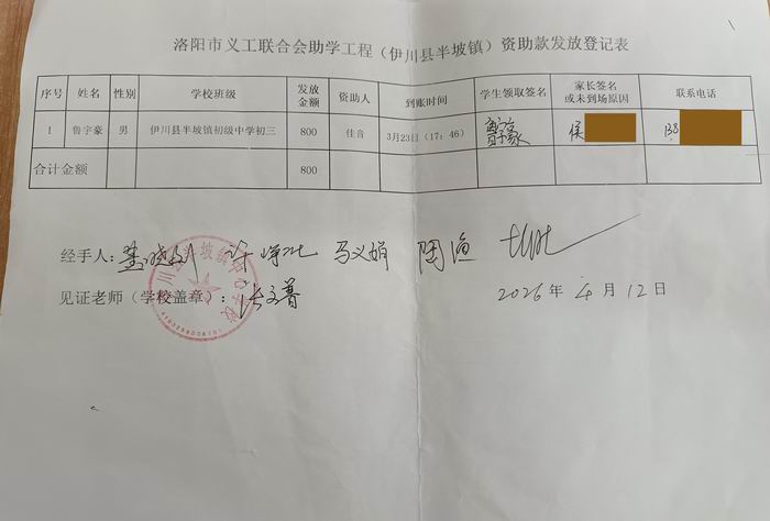 | 序号 | 姓名 | 性别 | 学校班级 | 发放金额 | 资助人 |