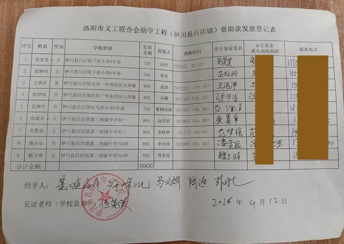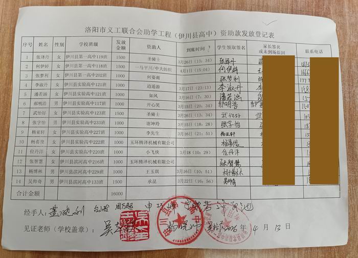 | 12 | 张智慧 | 女 | 伊川县滨河高中216班 | 1000 | 玉环腾泽机械有限公司 |