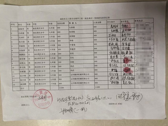| 12 | 张少锋 | 男 | 嵩县黄庄乡中 | 九年级 | 800 | 玉环腾泽机械有限公司 |