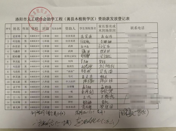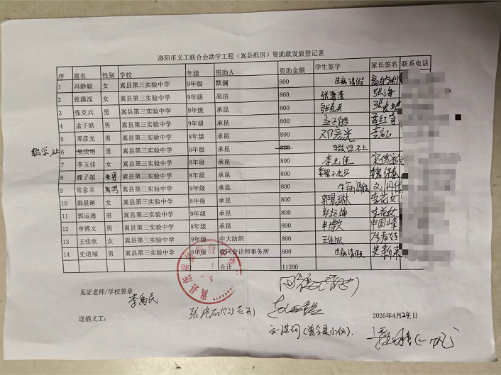 | 14 | 史道城 | 男 | 嵩县第三实验中学 | 8年级 | 致同会计师事务所 | 800 |