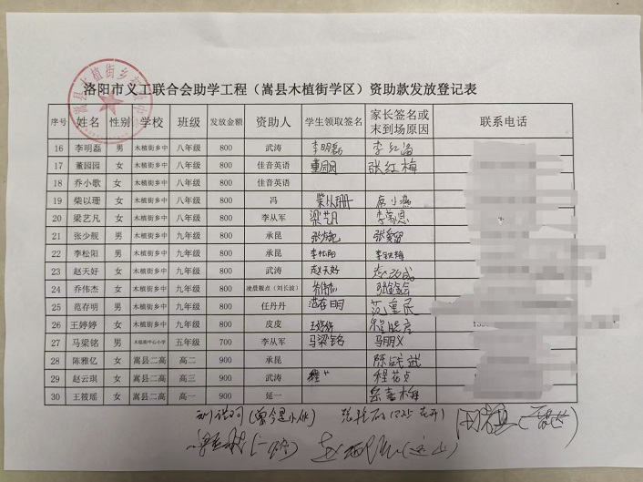 | 序号 | 姓名 | 性别 | 学校 | 班级 | 发放金额 | 资助人 |