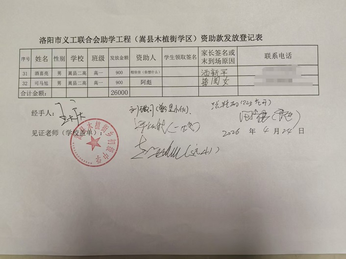 | 31 | 司马旭 | 男 | 嵩县二高 | 高一 | 900 | 阿彪 |