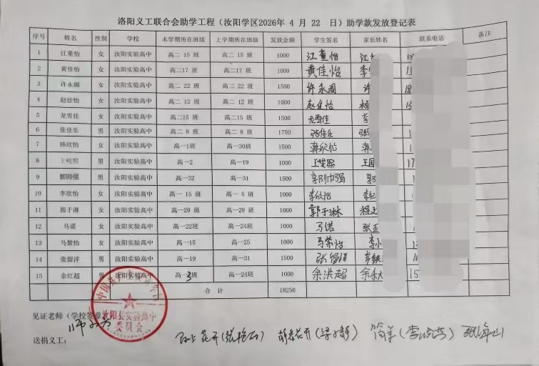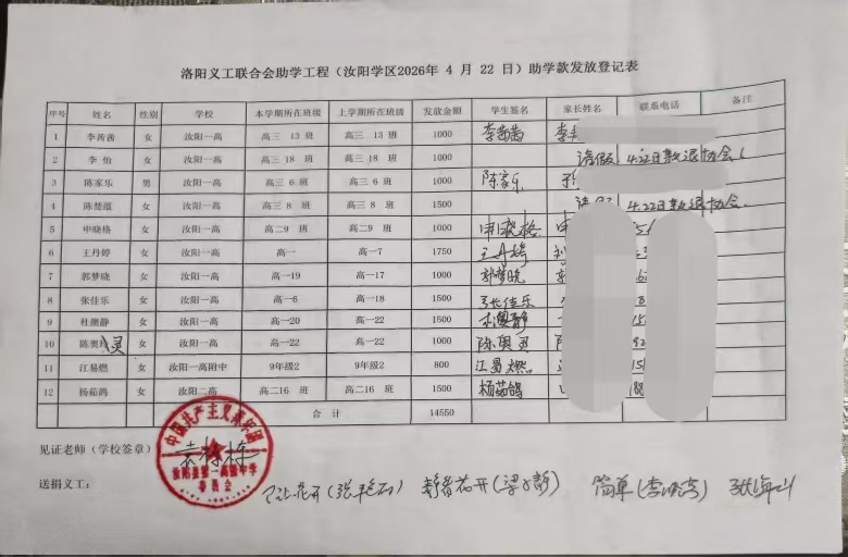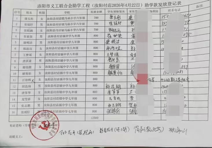 | 洛阳义工联合会助学工程(汝阳学区2026年 4 月 22 日)助学款发放登记表 | ||||||