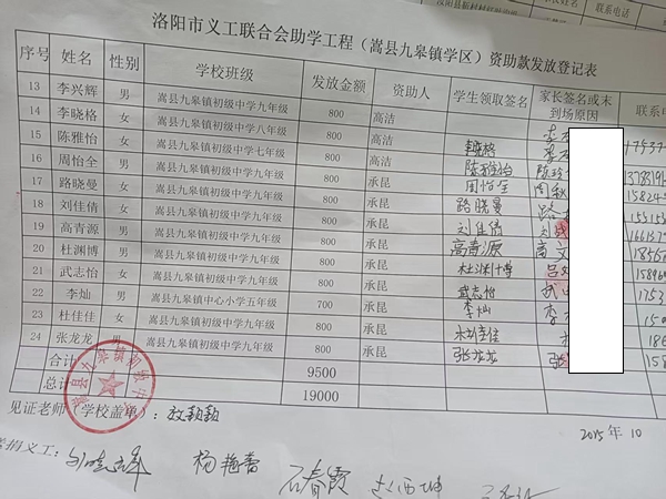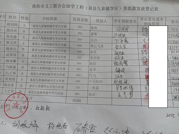洛阳市义工联合会助学工程是以提高山区教学质量,搭建公益平台,资助学生顺利完成学业为宗旨,以入户调查、寻求资助、做好学生后期管理为主要内容的公益活动组。 助学工程调查资助学生的年级范围为:小学四年级至高中四年级(复读一年者);小学四年级以下;以及部分代课老师。高中复读一年以上者不在调查范围和资助范围。助学工程也做一些帮助学校改善教学设施的活动,但此项工作不做为常规活动进行。 目前助学工程设定的资助标准如下: 1.小学生在校生活费700元/学期(从2021年9月份开始执行此资助标准) 2.初中生在校生活费800元/学期(从2021年9月份开始执行此资助标准) (目前国家对农村初中、小学的住校学生实行两免一补政策,所以小学和初中生没有学杂费) 3.高中生学费约1500元--2000元/年;在校生活费1500元/年(由于高中生资助金额比较高,资助人可以选择单纯资助学费或生活费) 资助流程 如果您要资助学生,请浏览:http://www.hlva.org.cn/studentlist.html?stype=1&sname=&sperson= 点击学生姓名可打开该学生的调查资料, 如果遇到和您的资助标准符合的学生,请点击“我要资助”,会弹出一张资助申请表,申请表的内容很简单,填写后“提交” 负责助学工程学生资料的义工通常会在48小时内给您回复 为方便资助人对学生的资助,洛阳市义工联合会开设的资助款转接帐户(资助人汇款后请通知助学工程负责人凌云剑): 开户行:中原银行股份有限公司 账号:6768 1009 0000 0065 83 户名:洛阳市义工联合会 洛阳市义工联合会助学工程资助款收支监督质疑电话: 凌云剑(助学工程负责人):18638829031。 天马(协会财务部负责人):13373798709 助学工程专用邮箱:hlvazx@126.com 2024年资助款收支公示贴链接:https://lyshangdu.com/thread-257566-1-1.html |
