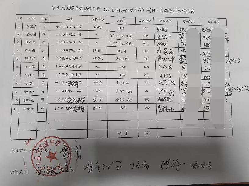 10月23日,一个阳光明媚的秋日,洛阳市义工联合会“河洛微光计划”的5位义工——张辉、李晓芳、丁咏梅、李胜利、赵晓辉怀揣着一份沉甸甸的爱,驱车前往汝阳前坪、十八盘、付店学区。不仅为31名困境学生送去了23700元助学款,更是带着资助人的大爱,把爱的种子种入受资助者的心间。