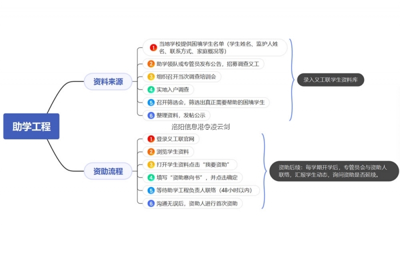 洛阳市义工联合会助学工程是以提高山区教学质量,搭建公益平台,资助学生顺利完成学业为宗旨,以入户调查、寻求资助、做好学生后期管理为主要内容的公益活动组。