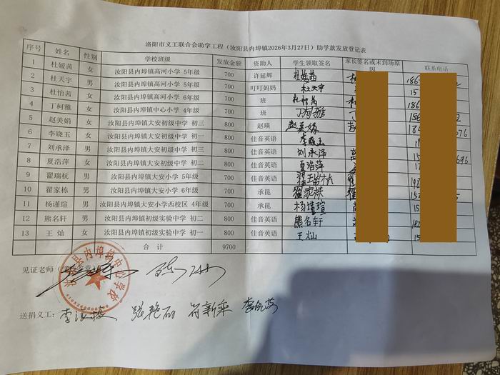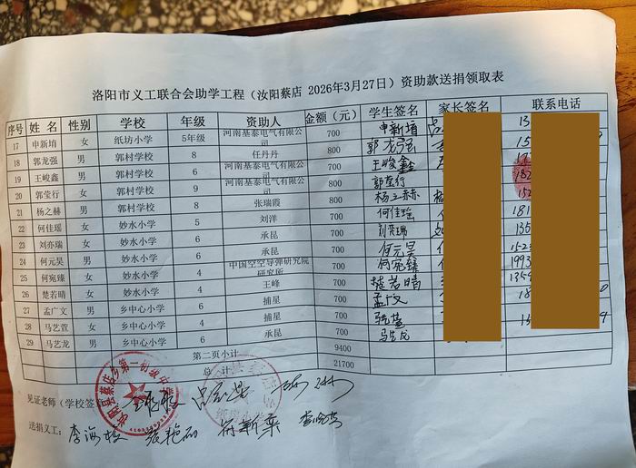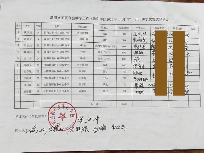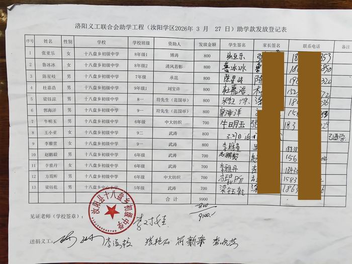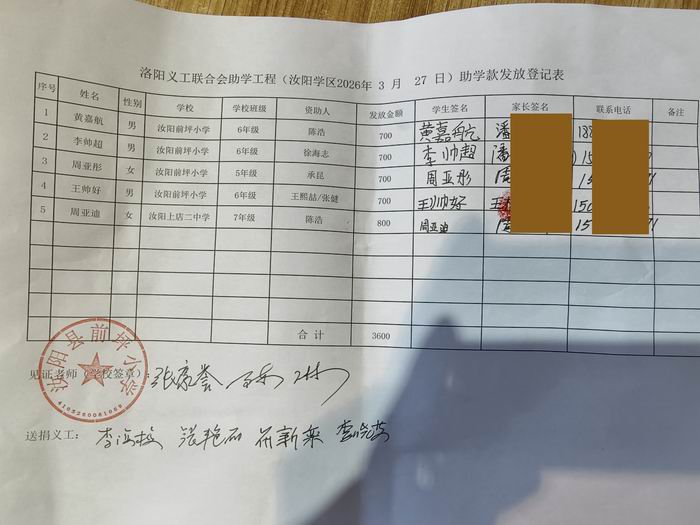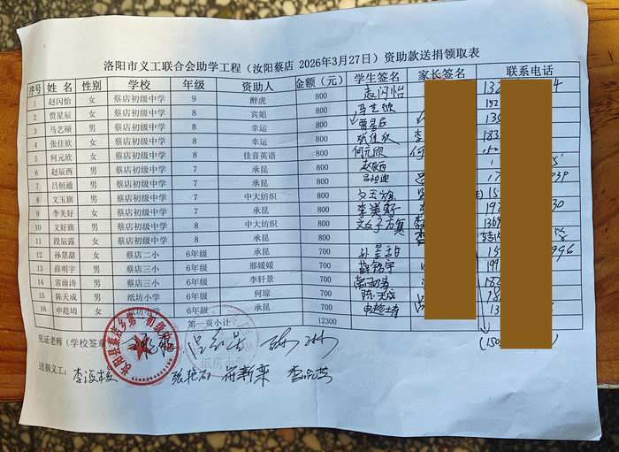| 洛阳市义工联合会助学工程(汝阳蔡店 2026年3月27日)资助款送捐领取表 | ||||||